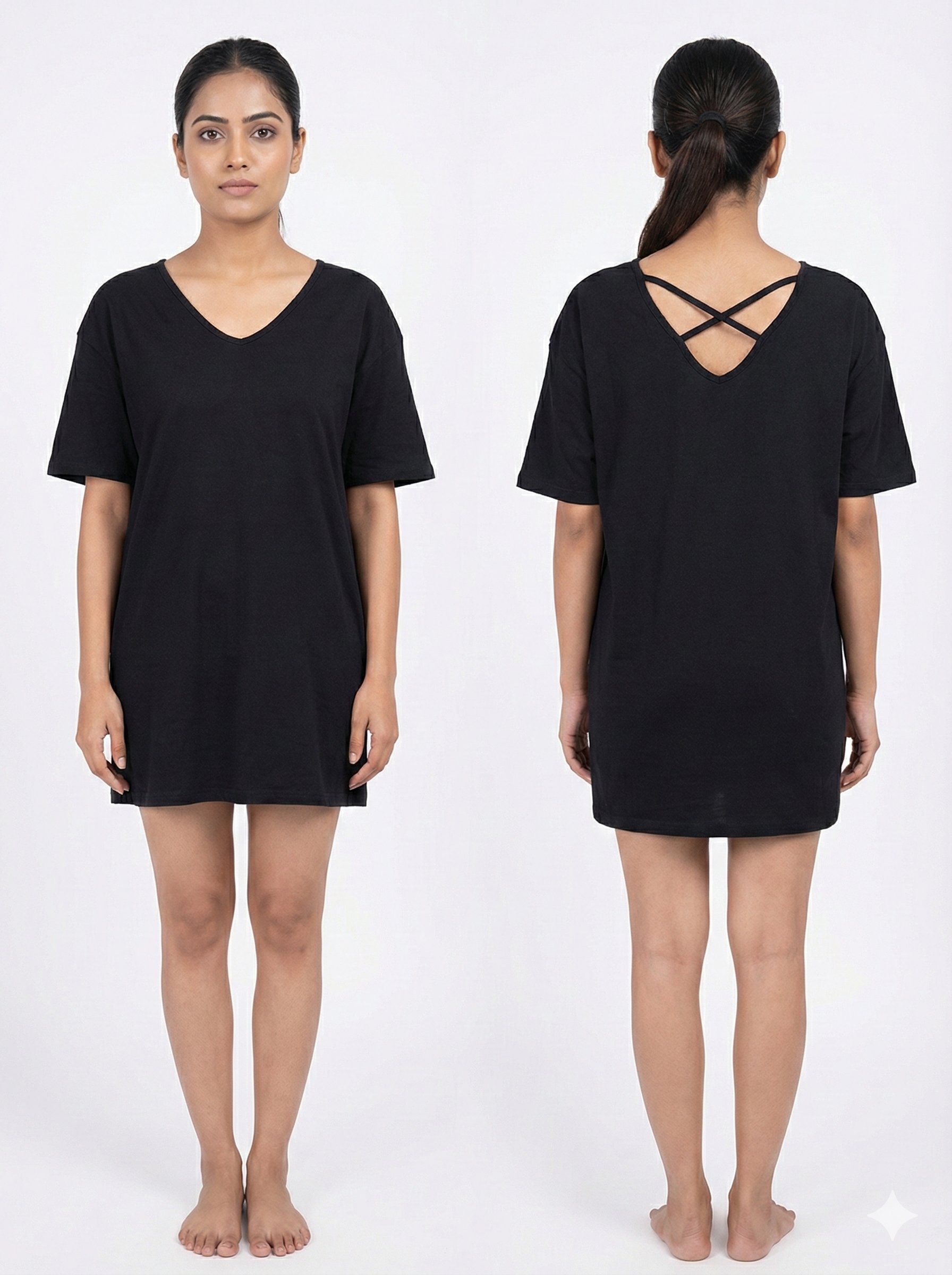 Be the first to review “Black V-Neck T-Shirt Dress with Criss Cross Back Detail”