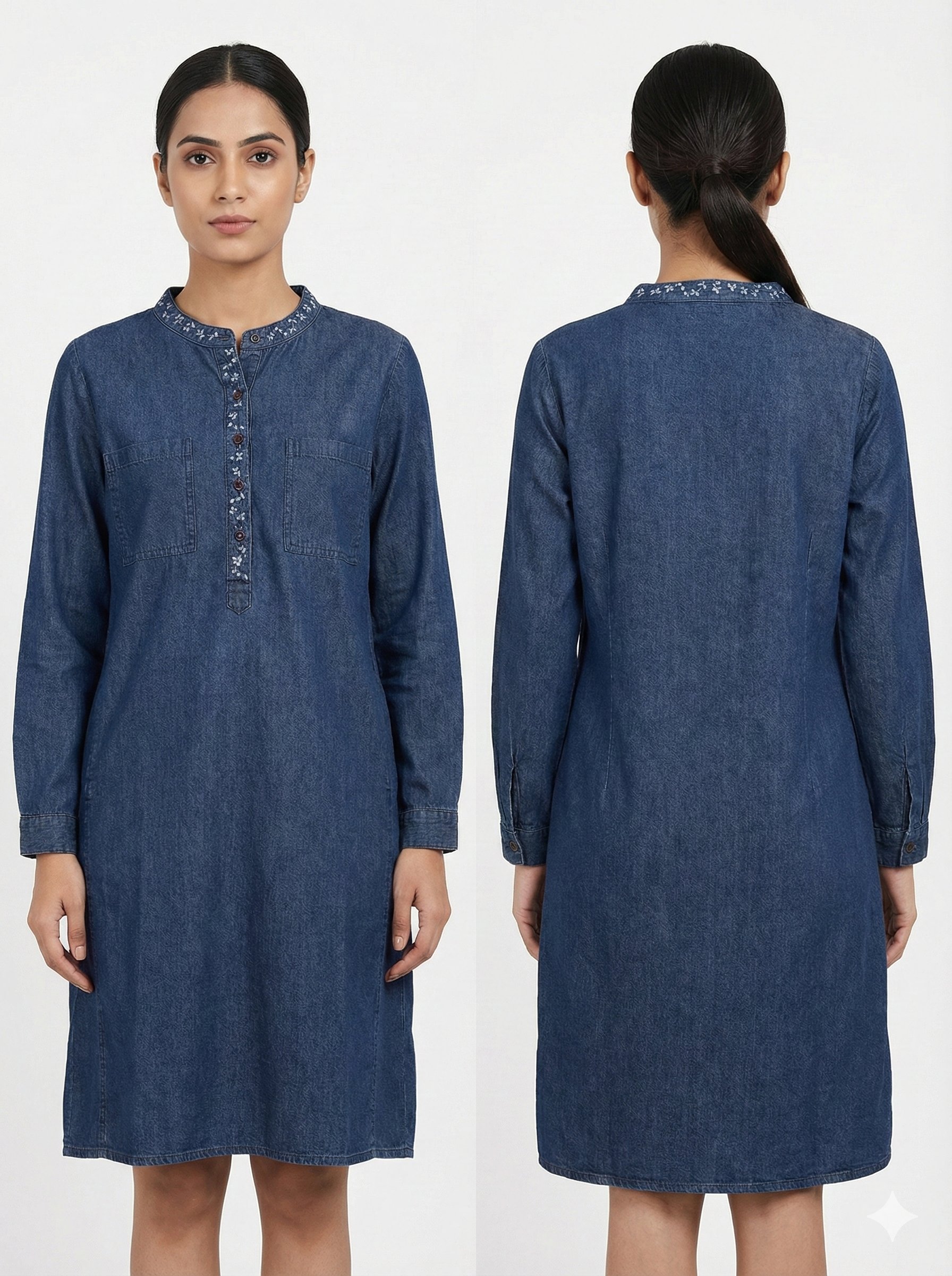 Blue Denim Shirt Dress with Mandarin Collar & Front Pockets
