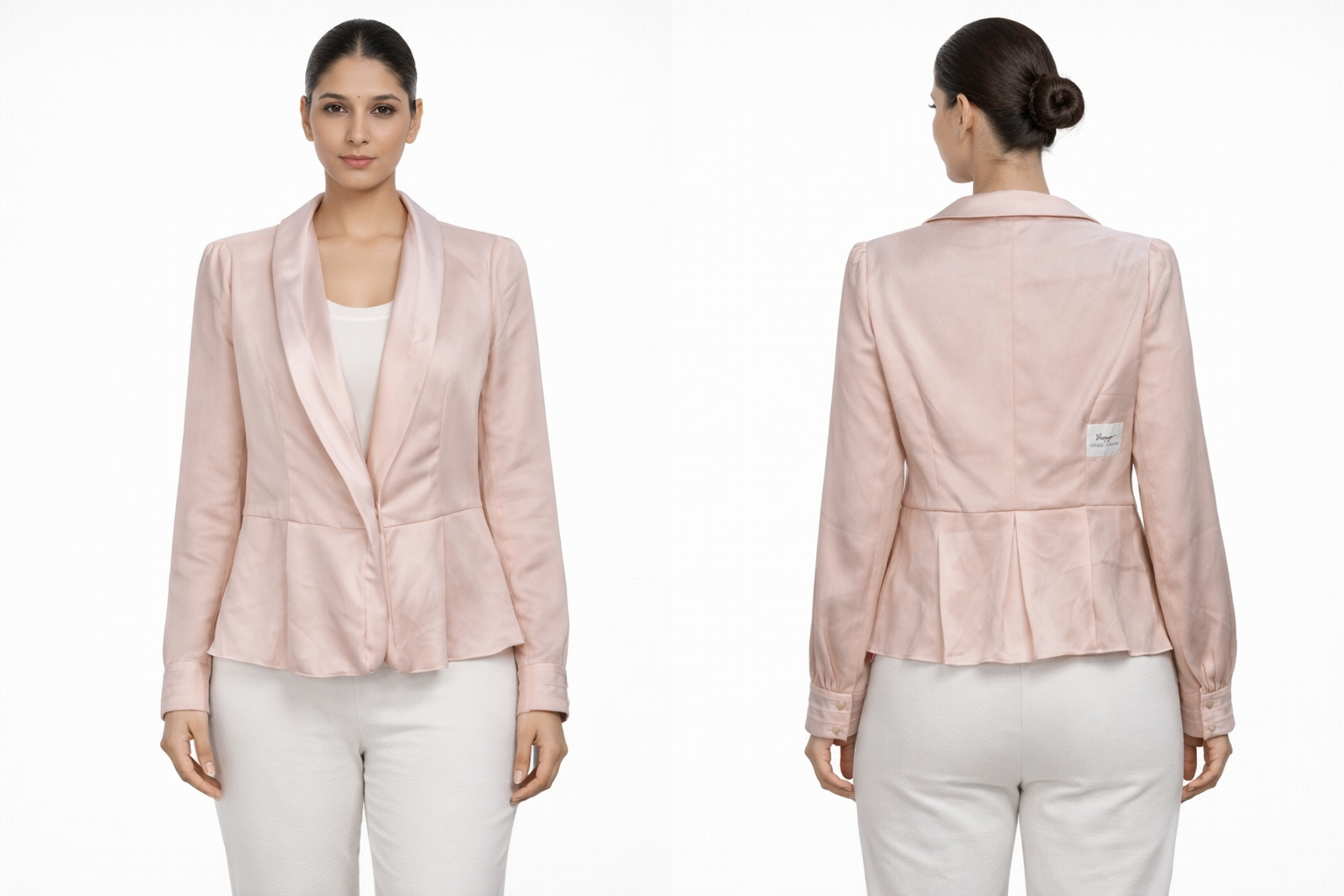 Be the first to review “Blush Pink Satin Lapel Blazer Jacket with Peplum Hem”