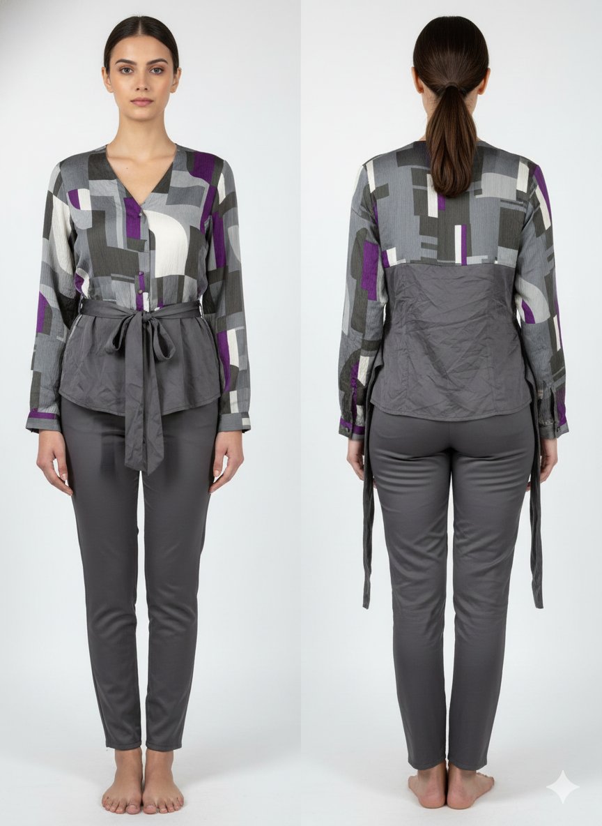 Grey Abstract Print Co-Ord Set with Tie-Up Waist