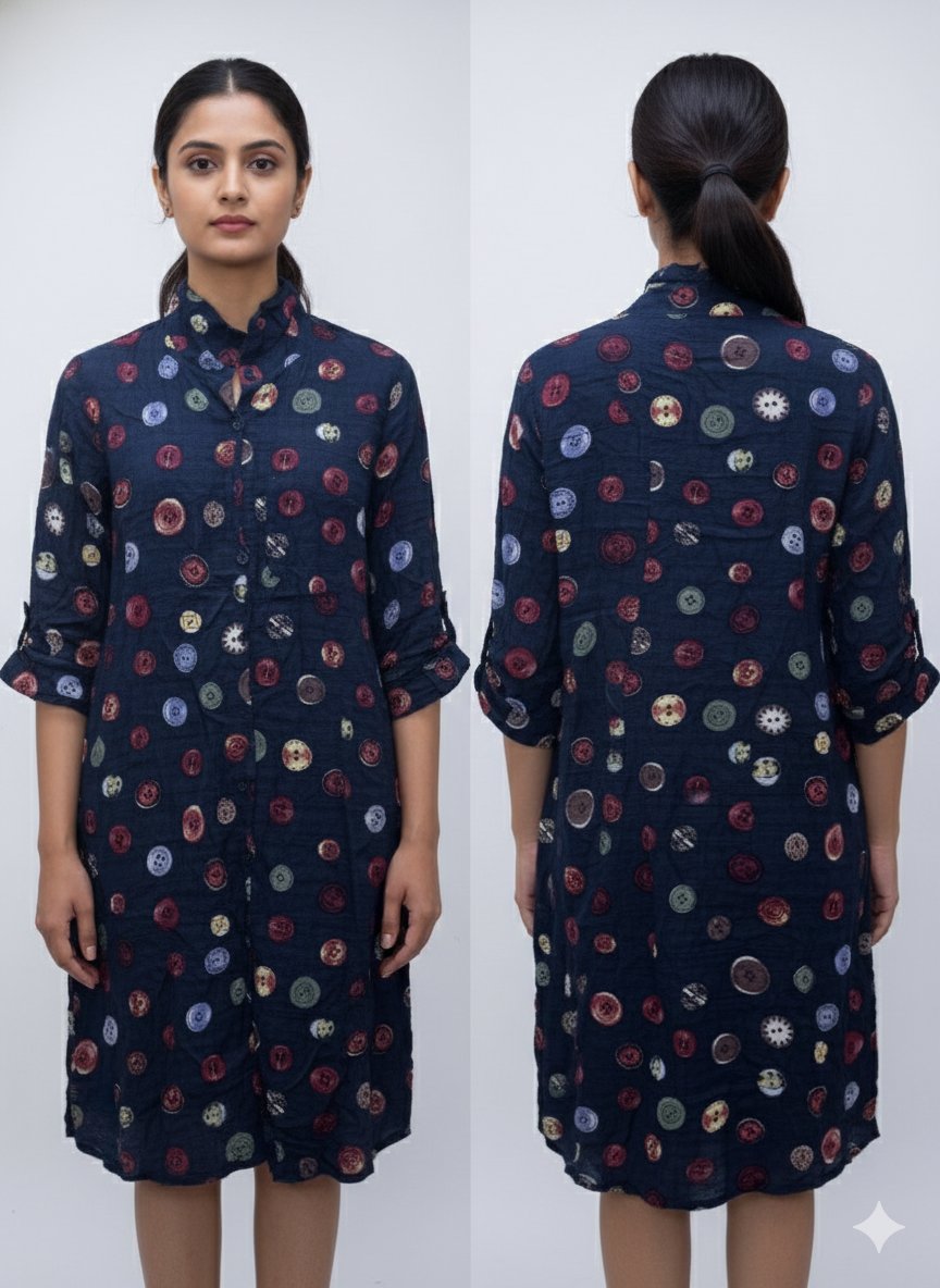 Navy Blue Button Print Shirt Dress with Mandarin Collar