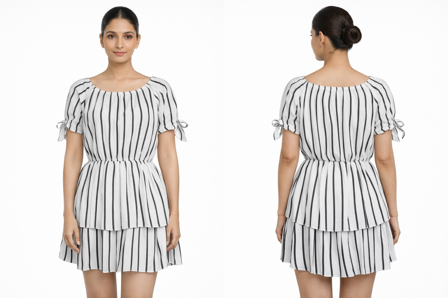 White & Black Striped Tiered Mini Dress with Tie-Up Sleeves