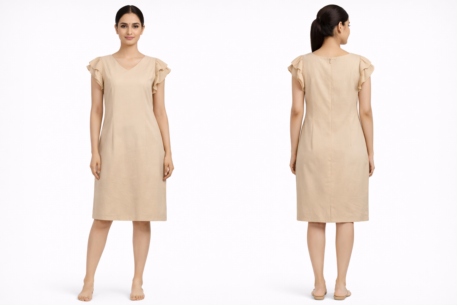 Elegant beige dress with soft ruffle sleeve detailing