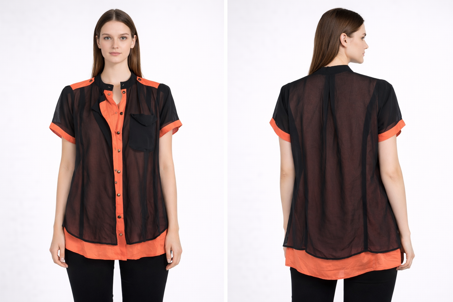 Stylish sheer black overlay with vibrant orange inner layer