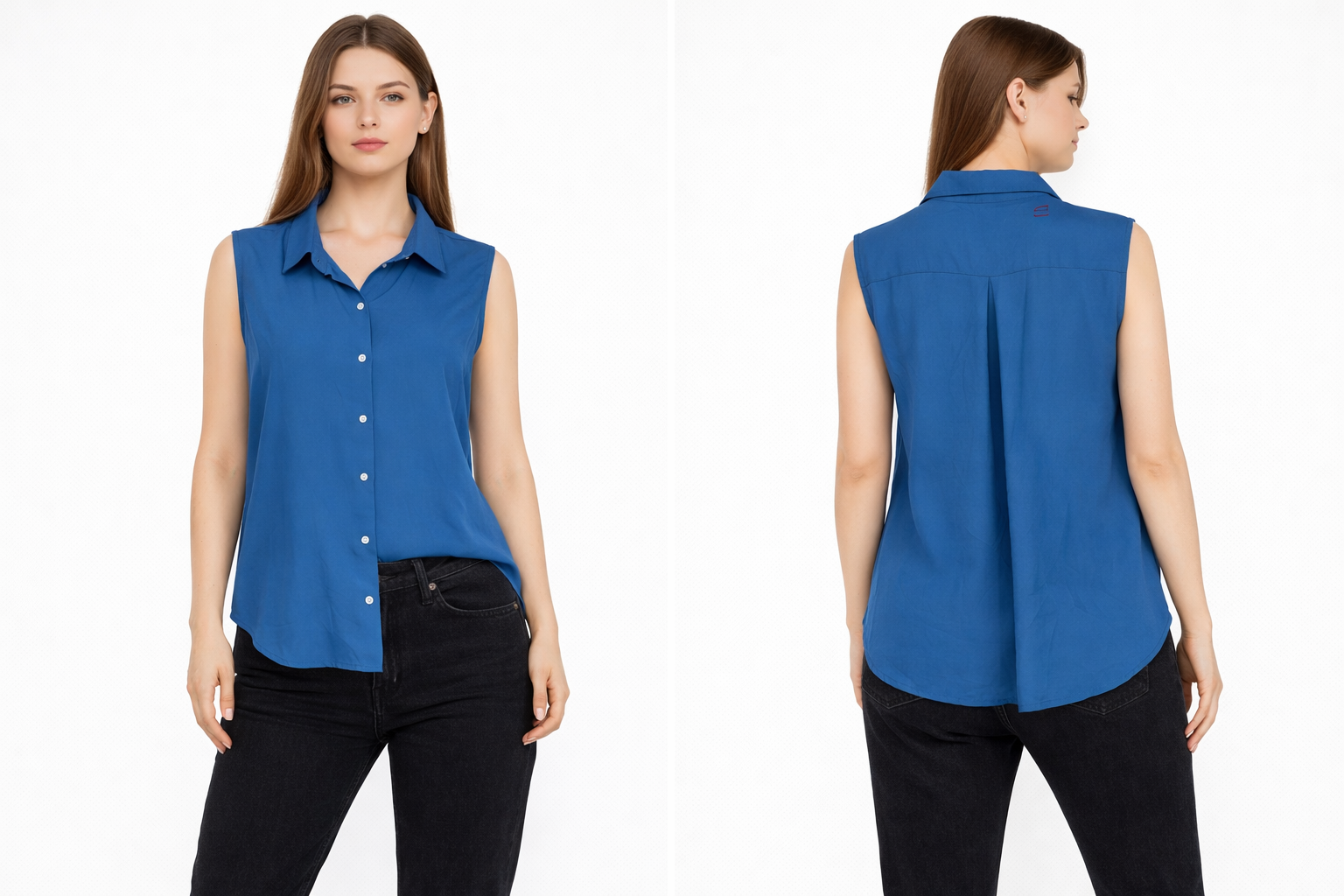 Solid blue sleeveless shirt with classic collar