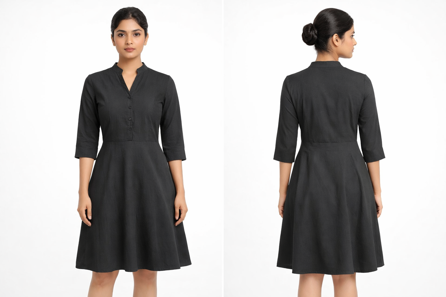 Women’s Solid Black Fit & Flare Dress with Mandarin Collar (3/4 Sleeves)
